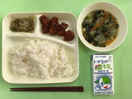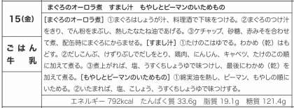 鮪のオーロラ煮、すまし汁ともやしとピーマンの炒めものでした。
