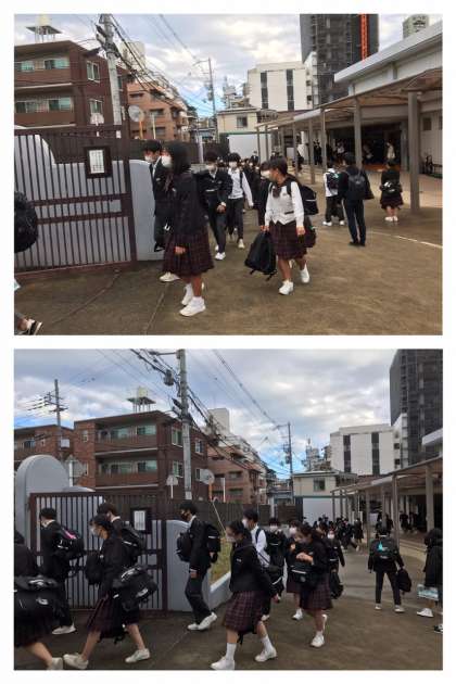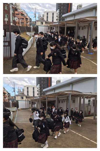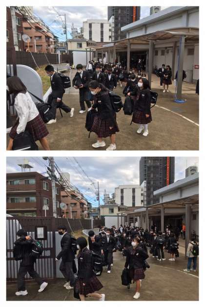 運動場にバスを入れられない(泥濘んでいる)ためにあべの翔学高等学校前まで移動します。