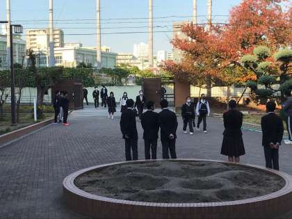 校門横の桜の木も色づき、落葉が多くなってきています。