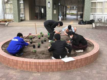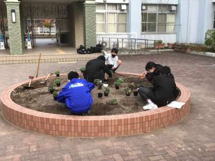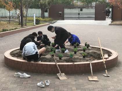 放課後の時間に後期生徒会の皆さんが、円形花壇に葉ボタンを植えてくれました。