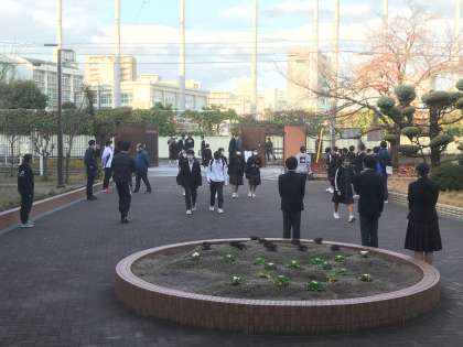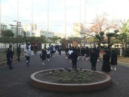 8時15分前、体育館に向かう1年生と登校して来た生徒が交錯しています。