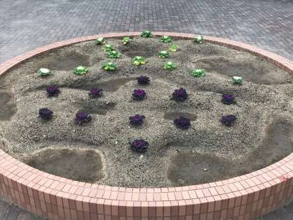 円形花壇の葉ボタンが少し大きくなりました。