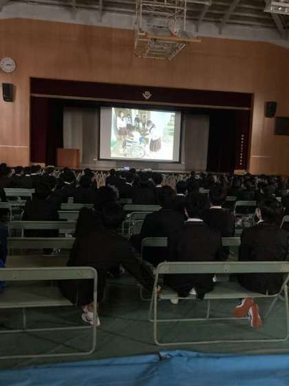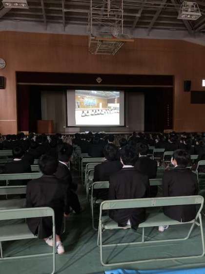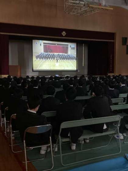 それを今日、卒業式の練習の後、3年生全員で鑑賞しました。1、2年生の時の行事の思い出の写真もあり、3年生はいよいよ卒業だ、という事を実感したと思います。金曜日が卒業式。3年生の皆さん、思い出に残る素晴らしい卒業式で文の里中学校から飛び立ってください。
