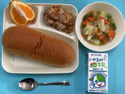 豆腐のミートグラタン、押麦と野菜のスープ、デコポンでした。