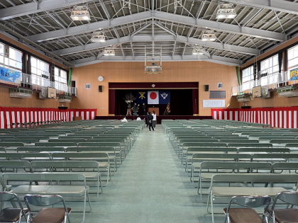体育館も準備が完了し、桜も満開で新入生を待ちわびています。