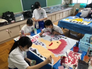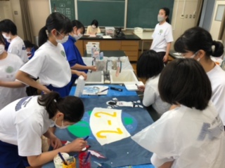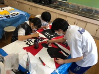 今日も2年生は、昨日に引き続き、学級旗制作を行っています。随分進みました。明日が完成予定日ですが、各クラス終わるでしょうか。5組は完成しました。クラスカラーは1組が緑、2組が青、3組がオレンジ、4組がピンク、5組が黄、6組が赤です。