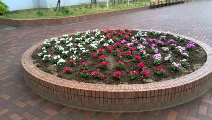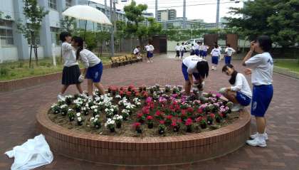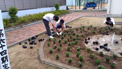 円形花壇と中庭に新しい花を植えるため、管理作業員さんと生徒会有志のメンバーと共に花を植えました。夏休みにはキレイな花を咲かせられるように、生徒会で花を育てていきます。来校するときは、是非ともご覧ください! 生徒会
