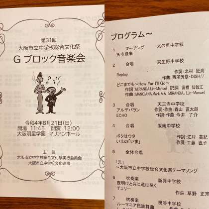 8/21(日)大阪明星学園マリアンホールにおいて、中学校文化連盟主催の『Gブロック音楽会』が開催されました。