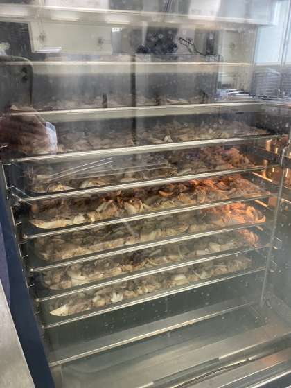今日は豚肉生姜焼きとじゃこピーマン。給食室の大型焼き物機が大活躍。