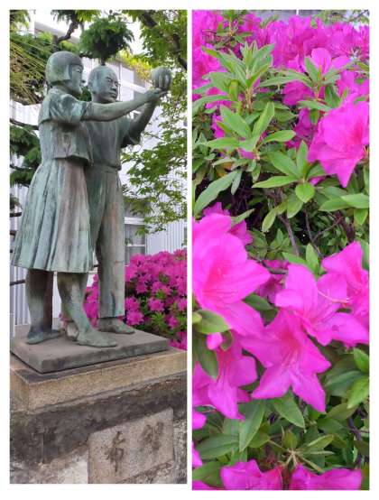 玄関の希望の像と満開のツツジたちがあなたを待っています。