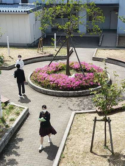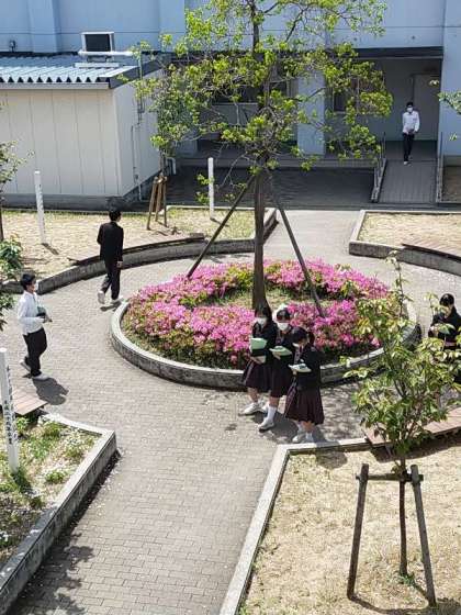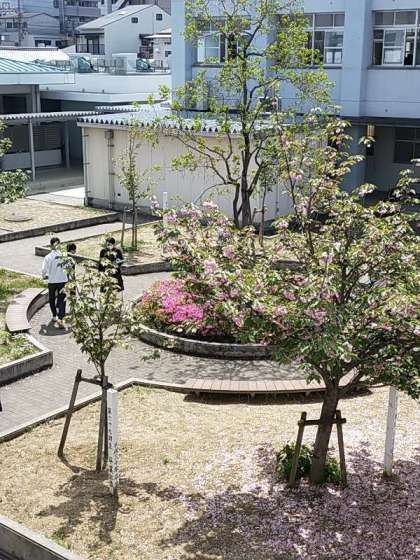朝は管理作業員の氏林さんが、夕方は生徒のみなさんが花びら舞う 中庭をキレイにしています。