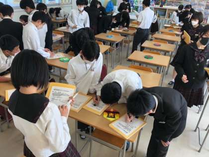 美術の時間 皆さんの木彫で浮き彫りの鑑賞会を行いました。
