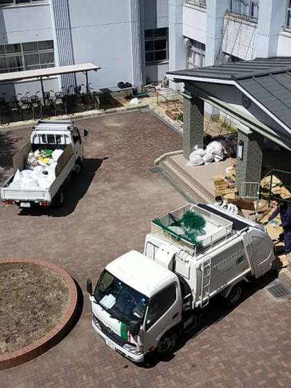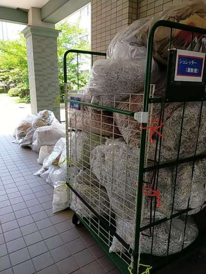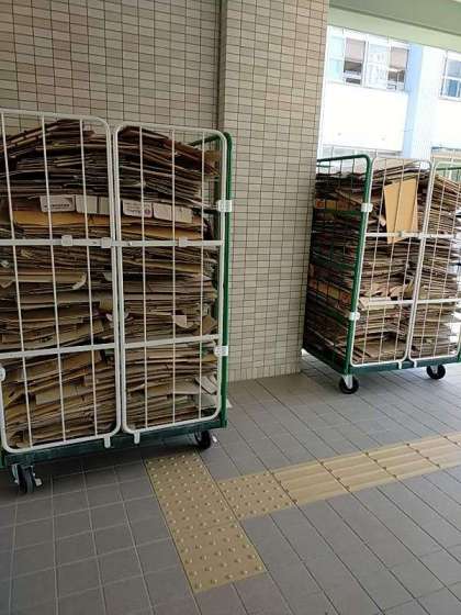 学校では、一か月に1回、食材の入った段ボールやシュレッターゴミなどの リサイクルできる古紙の回収作業を行っています。業者の方が学校を回って、回収作業を行っているのですが、写真にあるように、たくさんの生徒がいる文の里中学校では、わすか一か月でたくさんの古紙が排出されます。