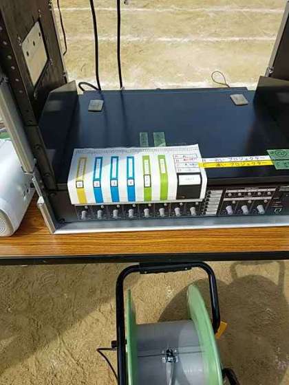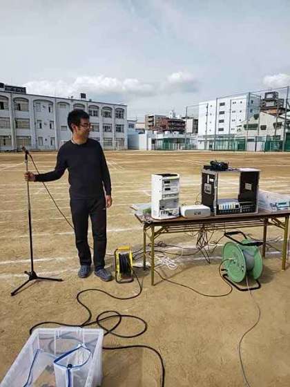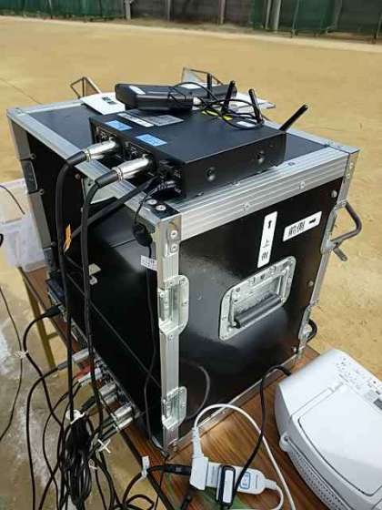 運動場では、山本さんが汗だくで体育大会で使用する放送設備の設置と点検を行っています。