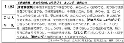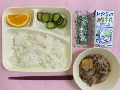 「すき焼き煮」は、牛肉、糸こんにゃく、あつあげ、たまねぎ、えのきたけを砂糖、みりん、塩、こいくちしょうゆで甘辛く味付けします。ご飯がすすむ献立です。