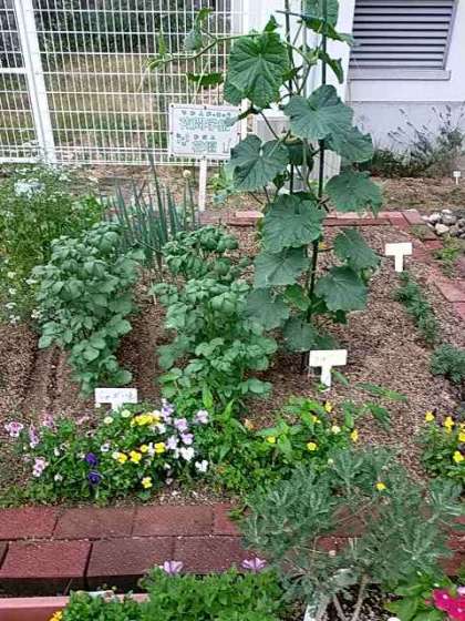 ○キュウリやナスの野菜のほか、ゆりやパンジーが咲いています。