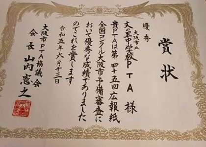 ●全国PTA広報紙コンクールの予備選において、優秀な成績をおさめ、写真のとおり表彰状をいただきました。