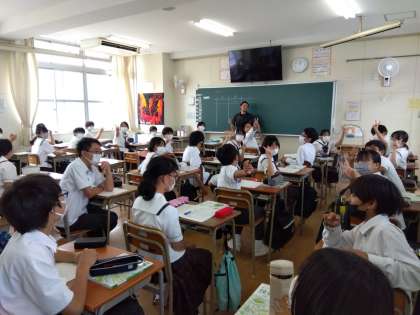 1年技術:材料の比較を学習しているところ。楽しい雰囲気で授業が進んでいました。