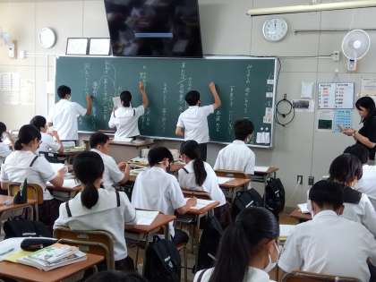 2年国語:短歌の学習で、技法等について調べたことを黒板に書いて発表しました。