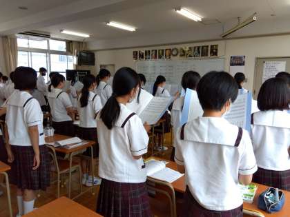 1年音楽:校歌など大きく美しい歌声で歌うことができていました。