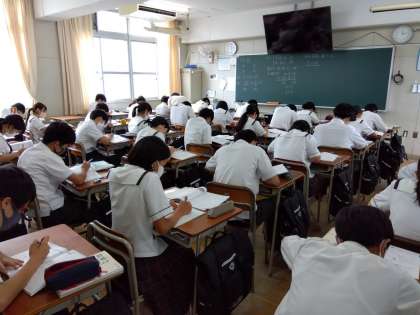 2年数学:連立方程式の問題演習。全員、静かに問題に取り組んでいます。