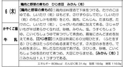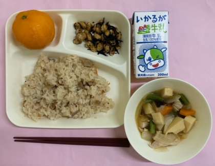 ひじき豆は、でん粉をまぶして、菜種油で揚げた大豆に、ひじきが入った甘辛い調味液をからませます。鉄やら食物繊維を多く含む献立です。