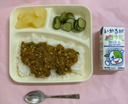今日の大豆入りキーマカレーライス[米粉]には、新食品の「豚レバー(チップ)」を使っています。