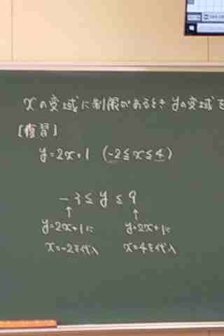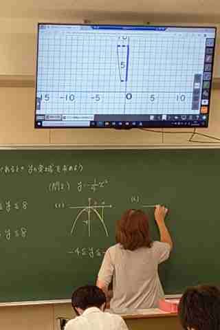 ○関数 y=ax?について、yの変域を求める学習でしたが、作図をしないと、誤った解を導きやすいことを、繰り返しICTを活用しながら説明していました。