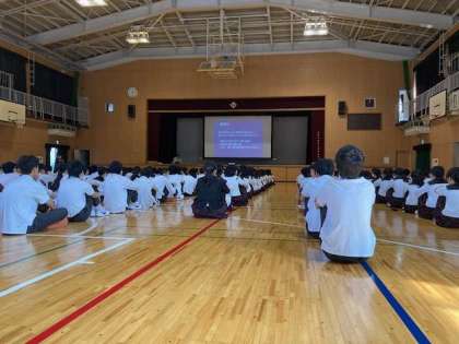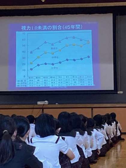 中学生に多い、近視の事を中心に学習しました。視力を保つ為には、何をしないといけないのか、何をしてはいけないのか、校医の湖崎先生からスライドを見ながら話を聞きまた。