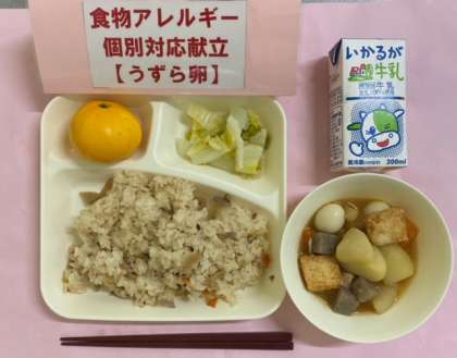 今日の給食には鶏肉、うずら卵、ごぼう平天、じゃがいも、こんにゃく、あつあげ、だいこん、にんじんが入っています。