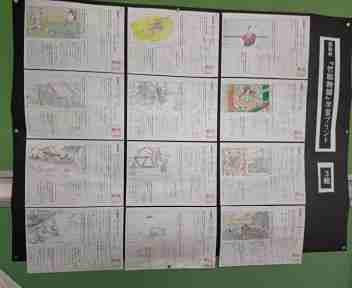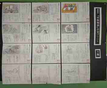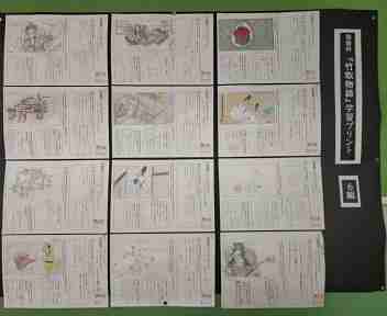 ○竹取物語の学習プリントが掲示されています。現在との風習、生活の違いについて考察しています。