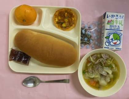 変わりピザはピザ生地の代わりに餃子の皮を使用しています。パリパリとした食感で生徒に人気の献立です。給食室で一つ一つ丁寧に手作りしています。