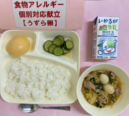 中華丼は豚肉、うずら卵を主材に、白菜、玉ねぎ、たけここ、にんじん、しいたけ、青みににらを使用しています。この献立は【うずら卵】の個別対応献立です。
