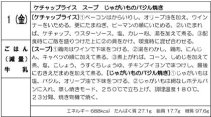 ケチャップライスは、ウインナー、ベーコン、玉ねぎ、ピーマンをいため、ケチャップ、ウスターソース、カレー粉などで味付けした具をご飯にかけ、混ぜ合わせて食べます。生徒に人気のケチャップ味に仕上げています。