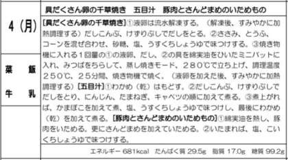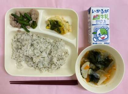 今日の給食の千草焼きは卵の中に、鶏肉、豆腐、コーン、みつばが入っています。