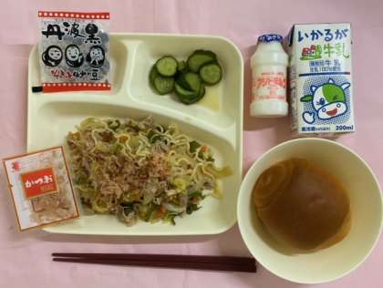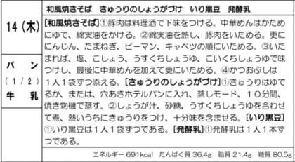 和風焼きそばは、豚肉を主材に、塩、こしょう、うすくちしょうゆ、こいくちしょうゆで味付けした焼きそばです。喫食時にかつおぶしをかけていただきます。生徒に人気の献立です。