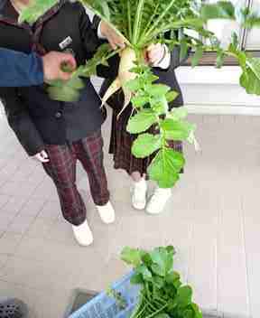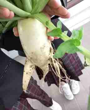 ○茶道部の生徒が大根を収穫してくれました。人形の大根をみせてくれました。