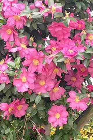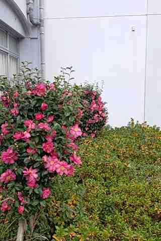 ○冬の季節に花を咲かせる山茶花(さざんか)。中庭できれいに咲きほこっています。