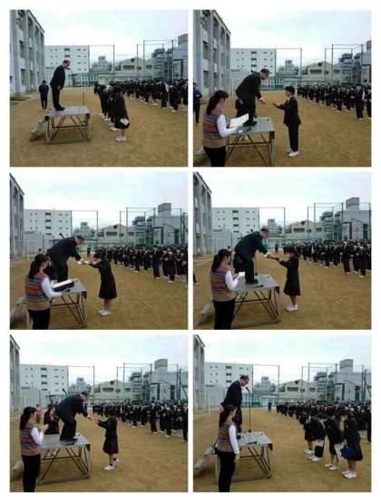○本日は久しぶりの運動場での実施です。表彰のあと校長先生からのお話がありました。