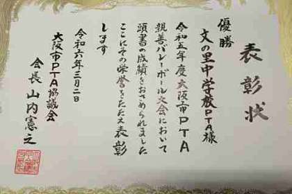 ○土曜日に大阪市PTA協議会主催の大阪市PTA親善バレーボール大会が行われ、文の里中学校PTAが、市内の他チームを破り、優勝いたしました。