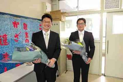 ○3月29日金曜日に教頭先生の離着任式を行いました。PTAならびにむつみ会、螢雪会、地域のご代表のみなさんのご出席のもと、杉原教頭先生の東中学校の副校長へのご昇進と坂東先生の教頭先生へのご昇進をお祝いしました。