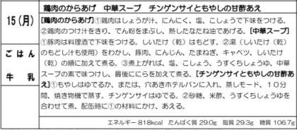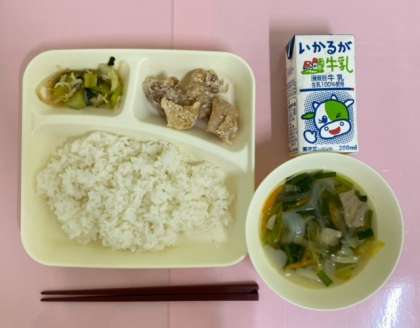 からあげは鶏肉にしょうが汁、にんにくなどで下味をつけ、でん粉をまぶし、風味よく油であげます。生徒に大人気の献立です。