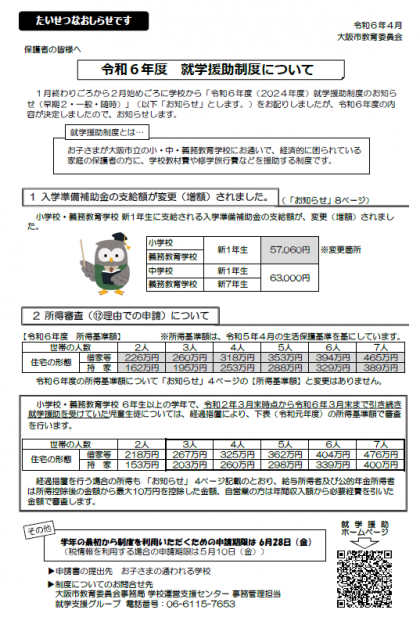 すでに学校より「令和6年度(2024年度)就学援助制度のお知らせ」を配付しておりますが、令和6年度の内容が決定しましたので、再度お知らせいたします。