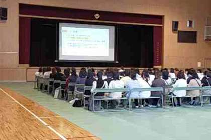 ○修学旅行保護者説明会が体育館で開催されました。中村主任から目的、行程、持ち物、アレルギー対応、その他注意事項の説明がありました。旅行会社からは保険適応とキャンセル料に関する説明がありました。