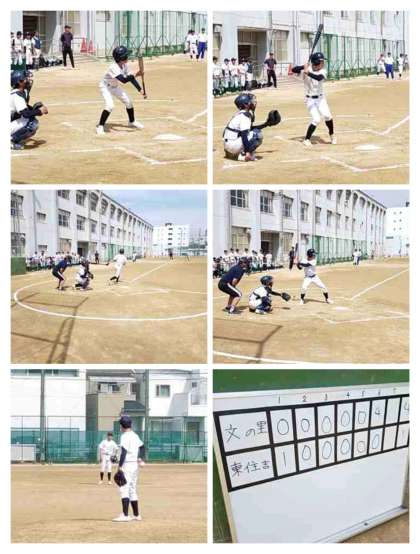 ○夏を思わせる晴天のもと、野球部は東住吉中学校と練習試合です。一点をあらそう好ゲーム。6回に打線が爆発し、最終7-2で勝利しました。