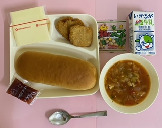 今日の給食では、鶏肉とキャベツ、玉ねぎ、トマト、にんじん、パセリなどの野菜が使われています。