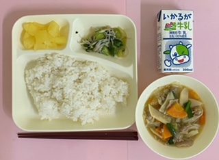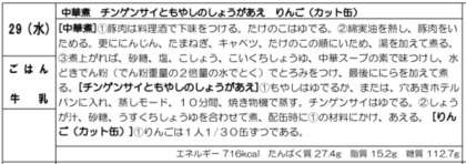 中華煮は、豚肉を主材に、キャベツ、玉ねぎ、たけのこ、にんじんを使用した中華風の煮ものです。青みにニラを使用し、彩をよくしています。