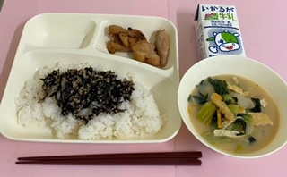 魚ミンチはスケソウダラをミンチ状に加工した食品です。給食では「魚ひじきそぼろ」として、ひじきと一緒に甘辛く味付けしています。