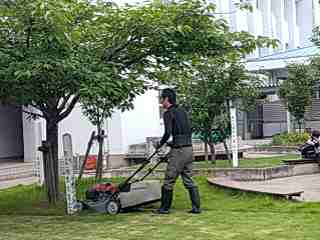 ○放課後、管理作業員さんが中庭の芝をきれいに刈っています。青い草の匂いが気持ち良い!