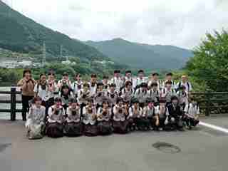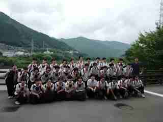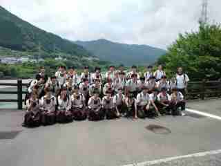 ○吉野川サービスエリアで山をバックに学級写真を撮影しました。